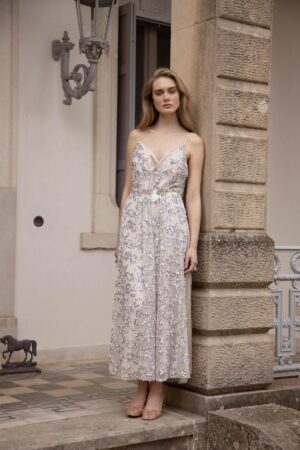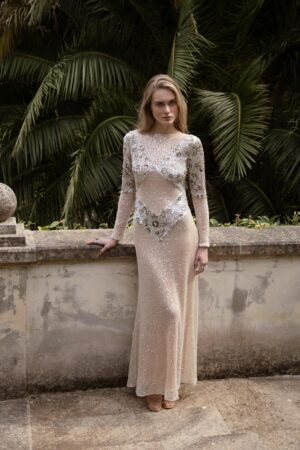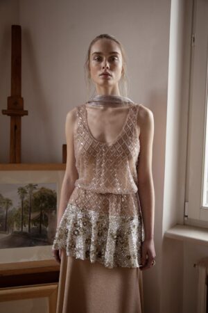 Nidodileda – Inframe Top Dress Bead Embroidered Sequined Hem – Nude/Silvery