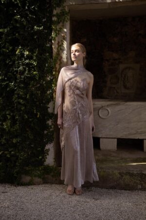 Nidodileda – Kinetic Dress Bead Embroidered Semi Sheer Foil Printed Tulle – Silvery Rose