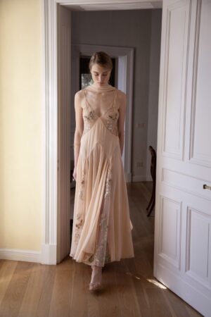 Nidodileda – Rise Dress & Scarf Muslin Bead Embroidered Semi Sheer – Nude