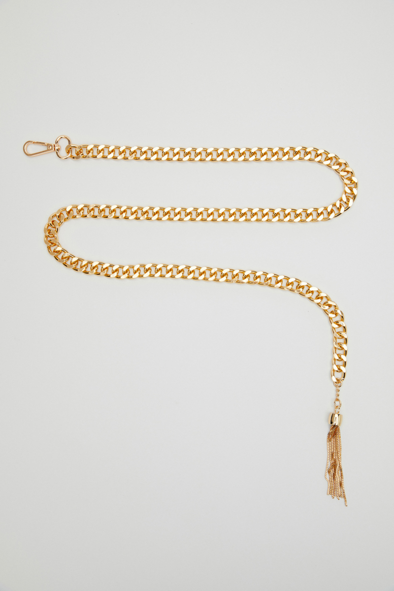 MATILDA γυναικεία ζώνη αλυσίδα. Είναι χρυσή και έχει στο τελείωμα της μια διακοσμητική φούντα. Αυξομειώνει με γαντζάκι. Είναι πολύ εντυπωσιακή και προτείνουμε να φορεθεί πάνω από οποιοδήποτε βραδινό φόρεμα .Μπορεί φυσικά να περαστεί και από τα θηλίκια του jean.Είναι one size και ταιριάζει σε όλους τους σωματότυπους. Είναι κατασκευασμένη από αλουμίνιο που έχει υποστεί την κατάλληλη επεξεργασία και έχει μεγάλη αντοχή και μοναδική αίσθηση. Είναι εξαιρετικά ανθεκτική σε όλες τις συνθήκες.