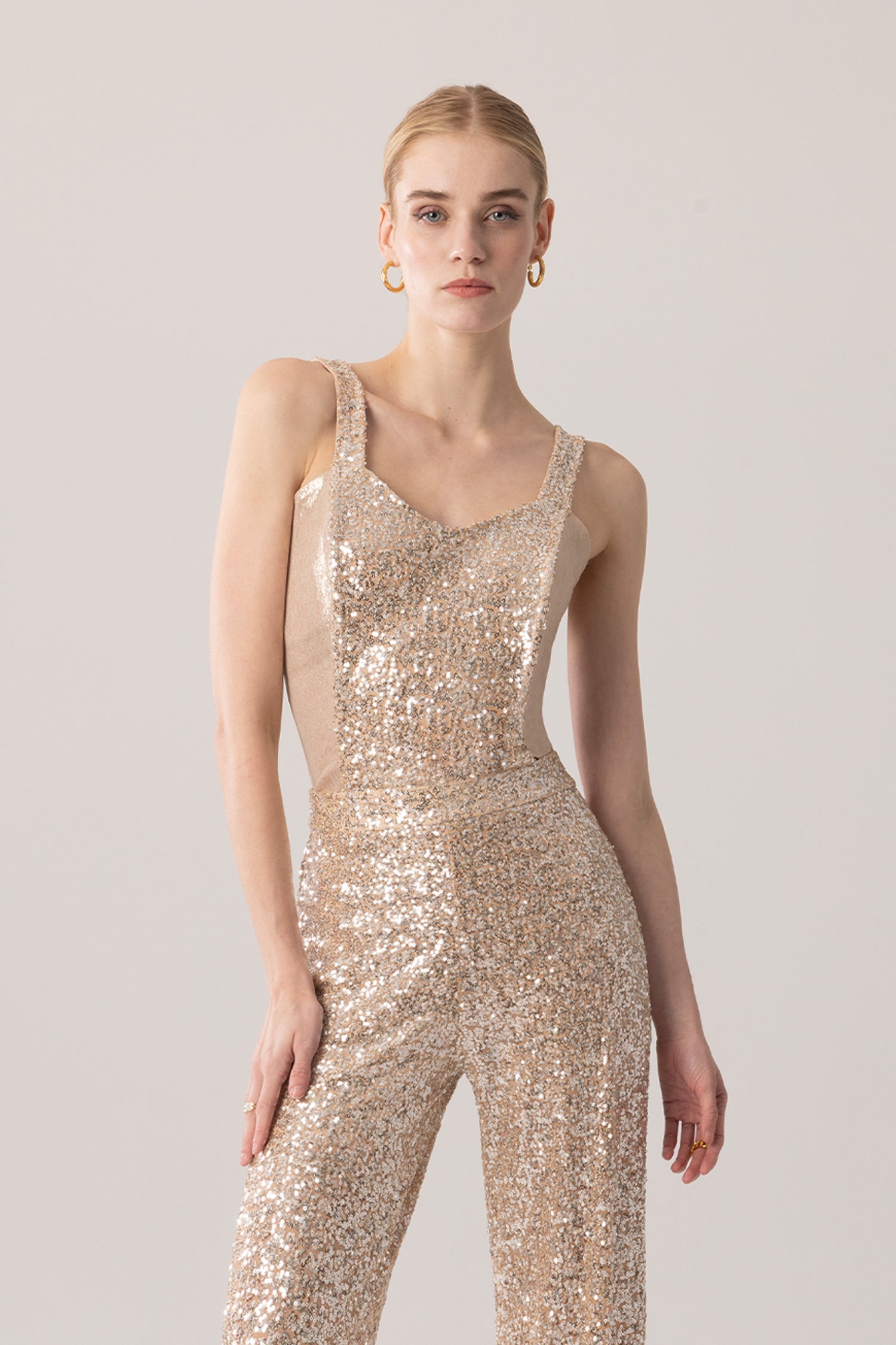 Εντυπωσιακό κορμάκι με ολόκληρη επιφάνεια καλυμμένη από λαμπερές παγιέτες σε champagne απόχρωση. Αγκαλιάζει το σώμα και δημιουργεί μία sleek, θηλυκή σιλουέτα, ενώ τα διακριτικά χρυσά πλαϊνά χαρίζουν μοντέρνα ένταση. Ιδανικό για βραδινές εμφανίσεις ή συνδυασμένο με την ασορτί παντελόνα για total glam αποτέλεσμα.