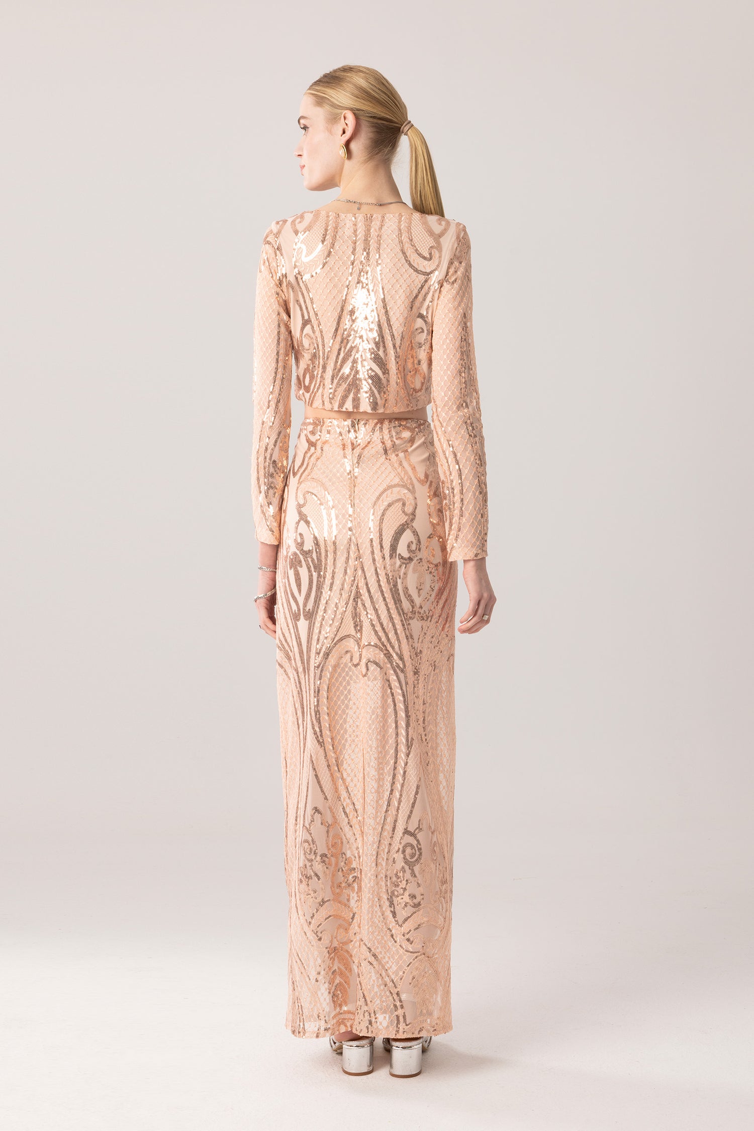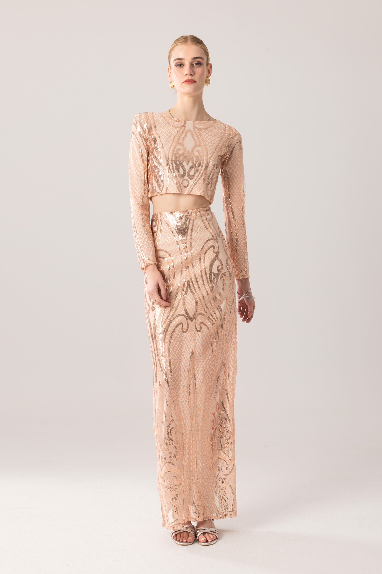 Εντυπωσιακό set με geometric μεταλλικό μοτίβο και διακριτική λάμψη. Διαθέτει στρογγυλή λαιμόκοψη και μακριά μανίκια, ενώ το μήκος του αναδεικνύει τη μέση δημιουργώντας κομψή, σύγχρονη γραμμή. Το ψηλόμεσο κόψιμο αναδεικνύει τη μέση