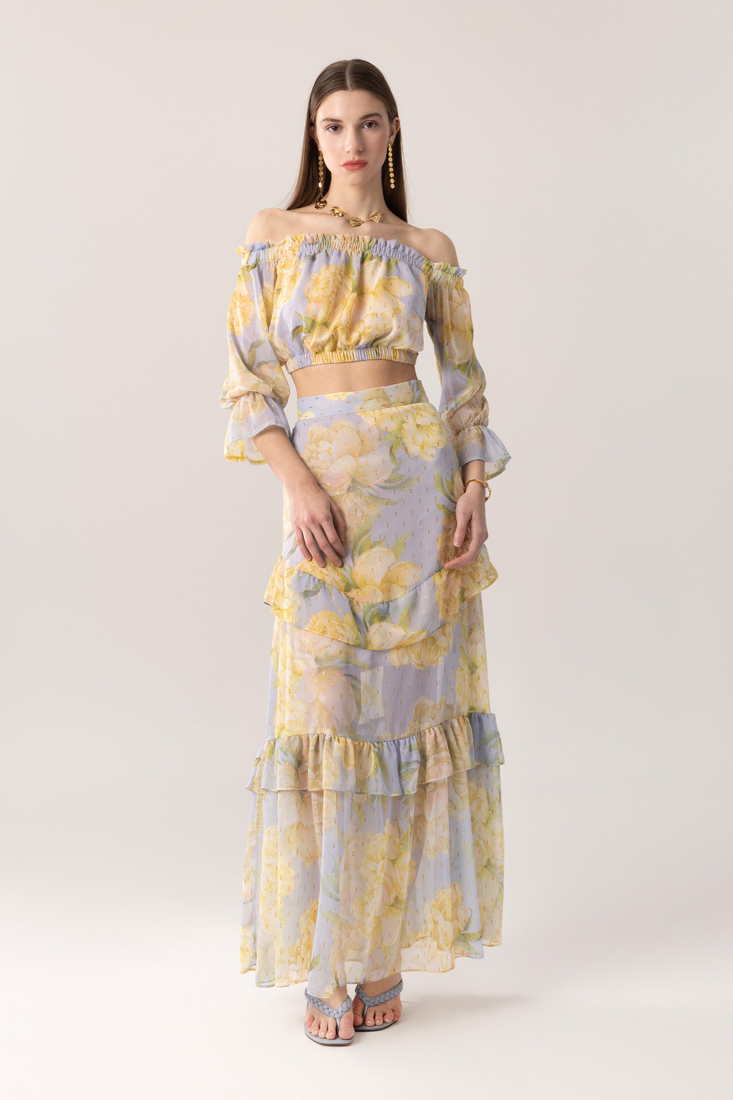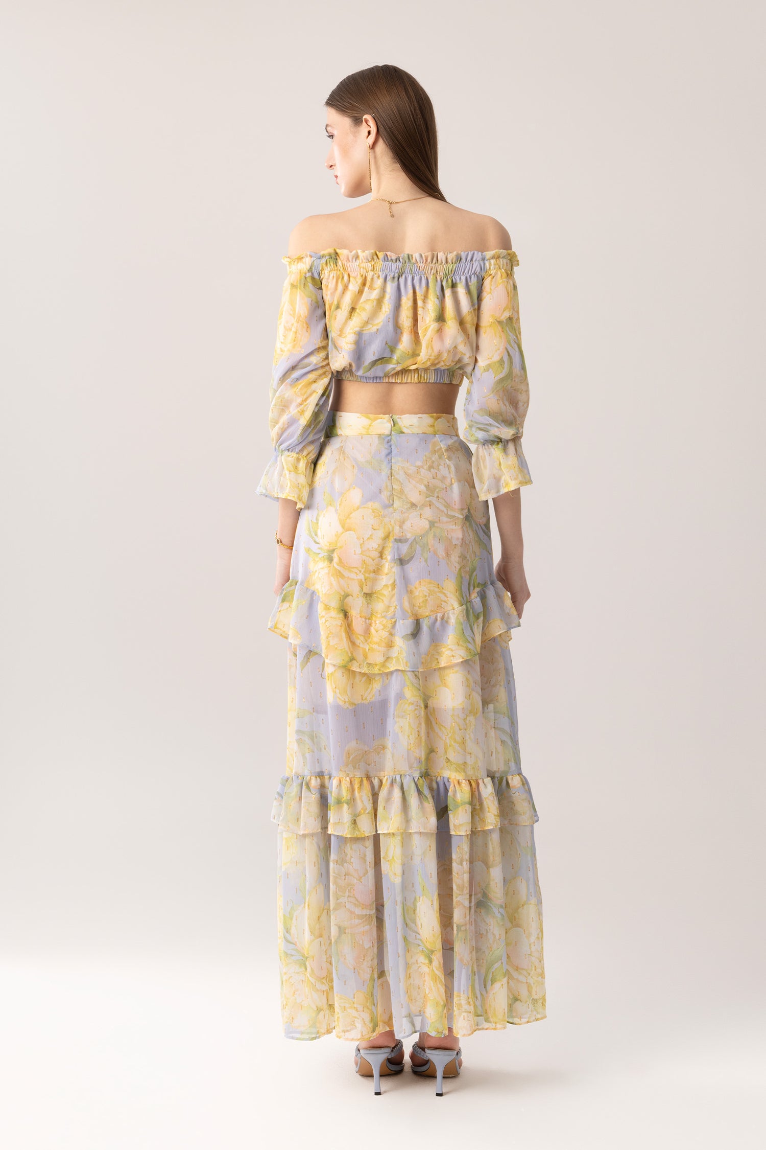 Σετ σε γαλάζια-παστέλ απόχρωση με κίτρινο floral μοτίβο και διακριτικές χρυσές πινελιές. Ψηλόμεση γραμμή που αναδεικνύει τη μέση και πέφτει σε ρευστή σιλουέτα με βολάν λεπτομέρειες που χαρίζουν κίνηση. Ένα κομμάτι γεμάτο καλοκαιρινή κομψότητα.