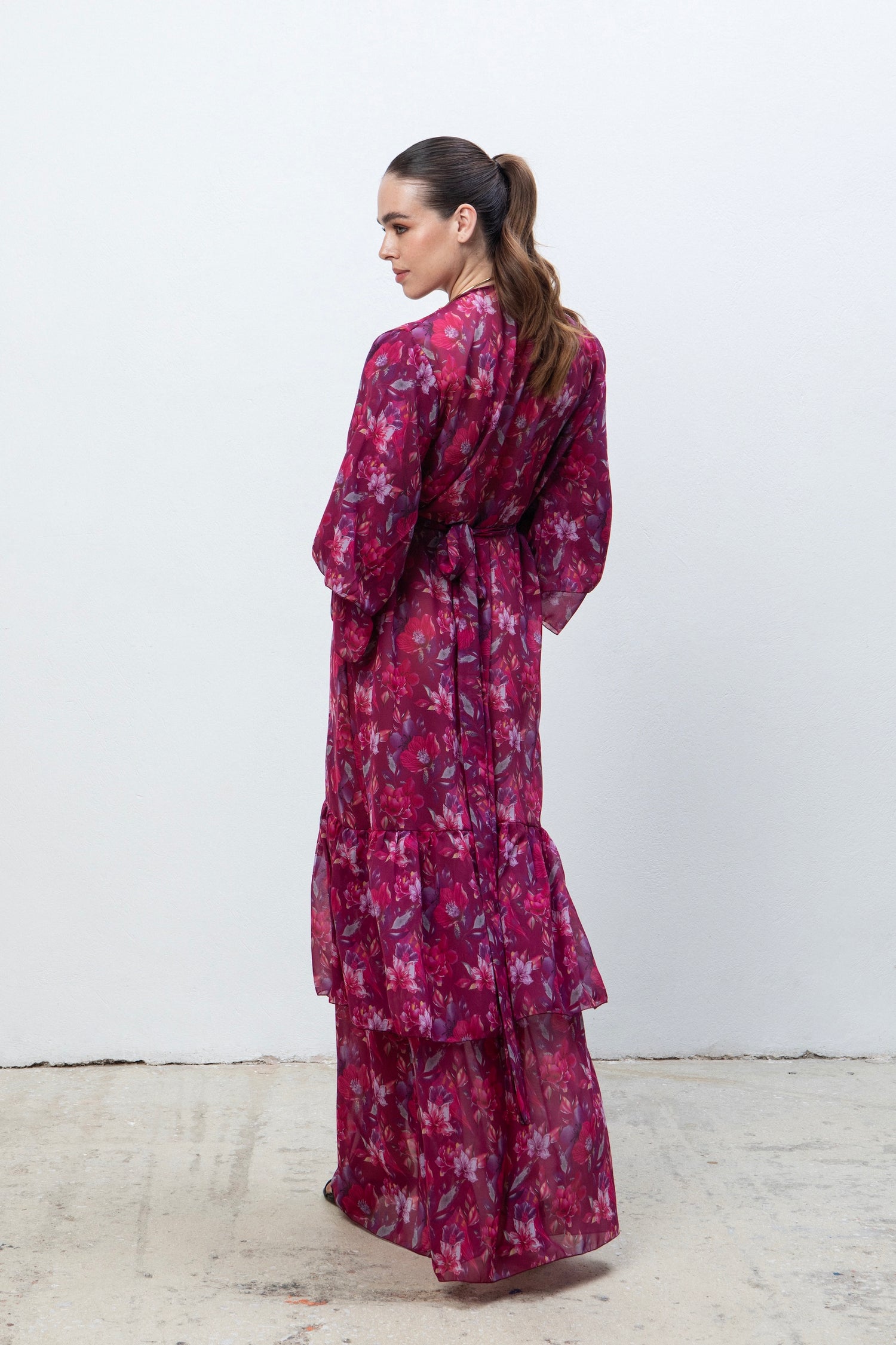 Το AMANDA POLYMORPHIC KIMONO DRESS ξεχωρίζει για τη maxi γραμμή του και το πλούσιο floral μοτίβο σε βαθιές αποχρώσεις. Τα kimono μανίκια προσθέτουν αέρινη κίνηση, ενώ το δέσιμο στη μέση αγκαλιάζει το σώμα και αναδεικνύει τη σιλουέτα.