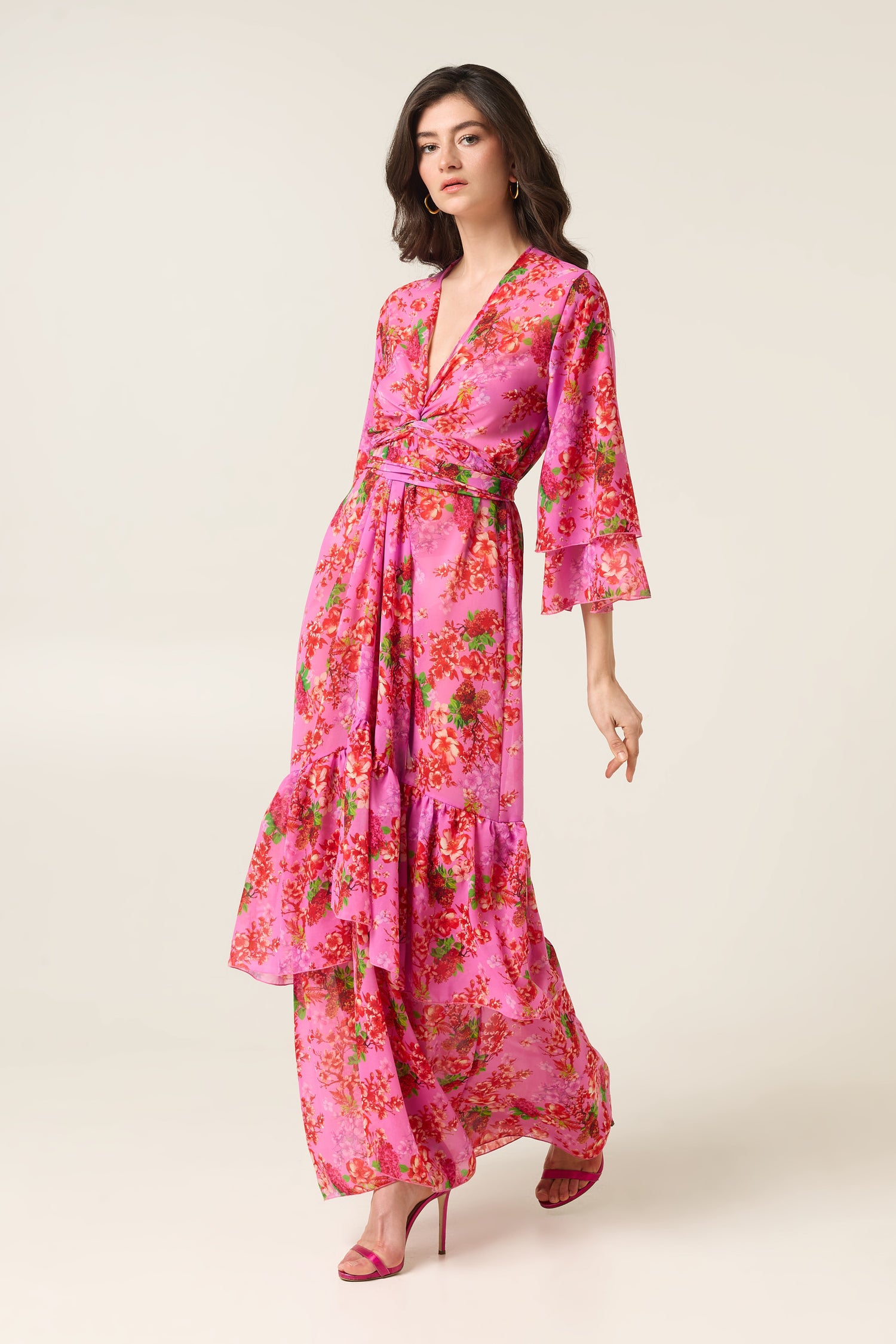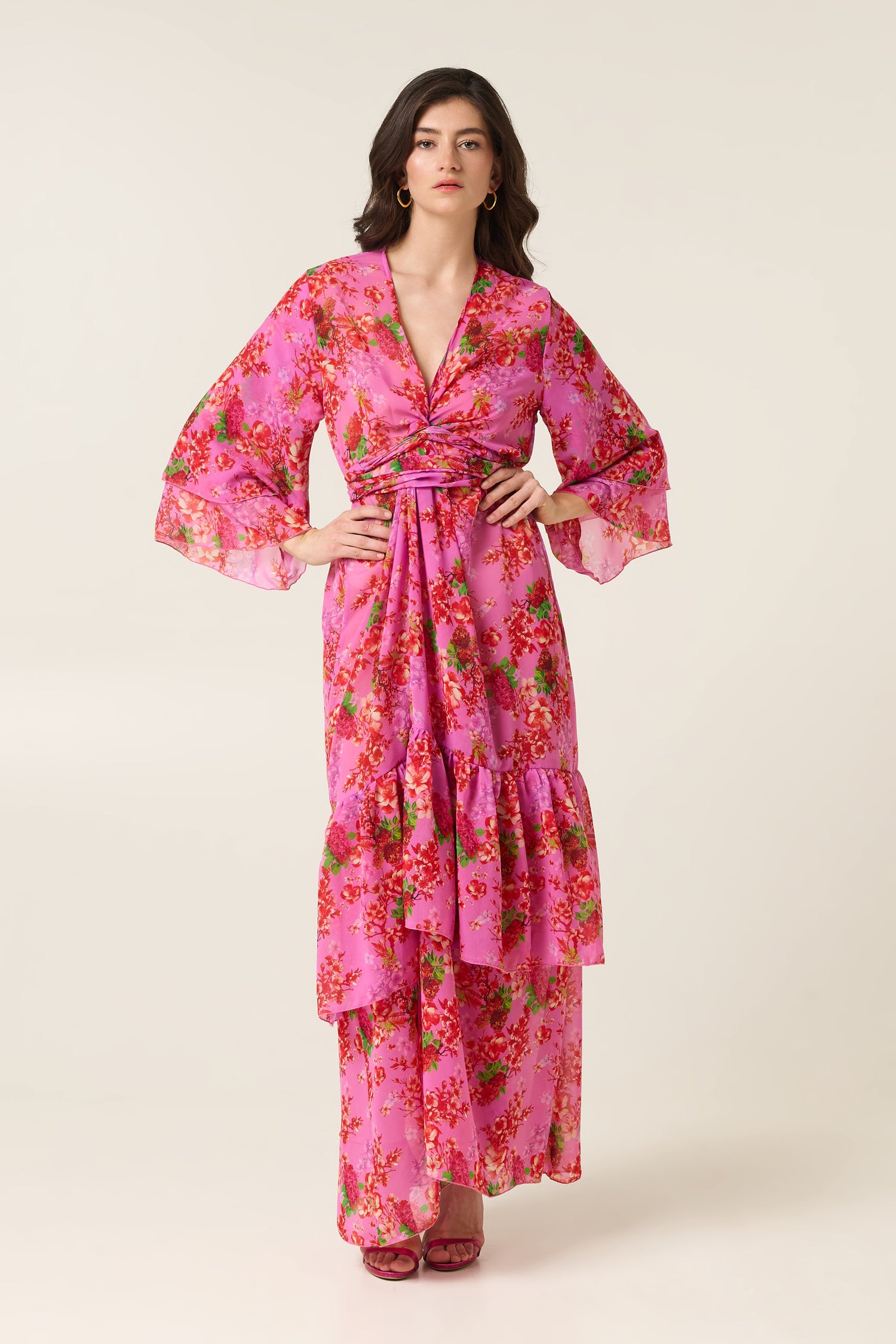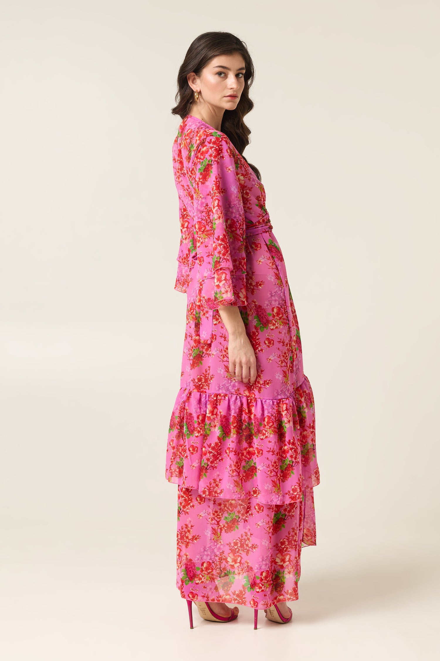 Η φούστα με τις ασύμμετρες στρώσεις δημιουργεί όμορφη κίνηση, ενώ το floral μοτίβο σε έντονες ροζ αποχρώσεις αποπνέει θηλυκότητα και καλοκαιρινή διάθεση.