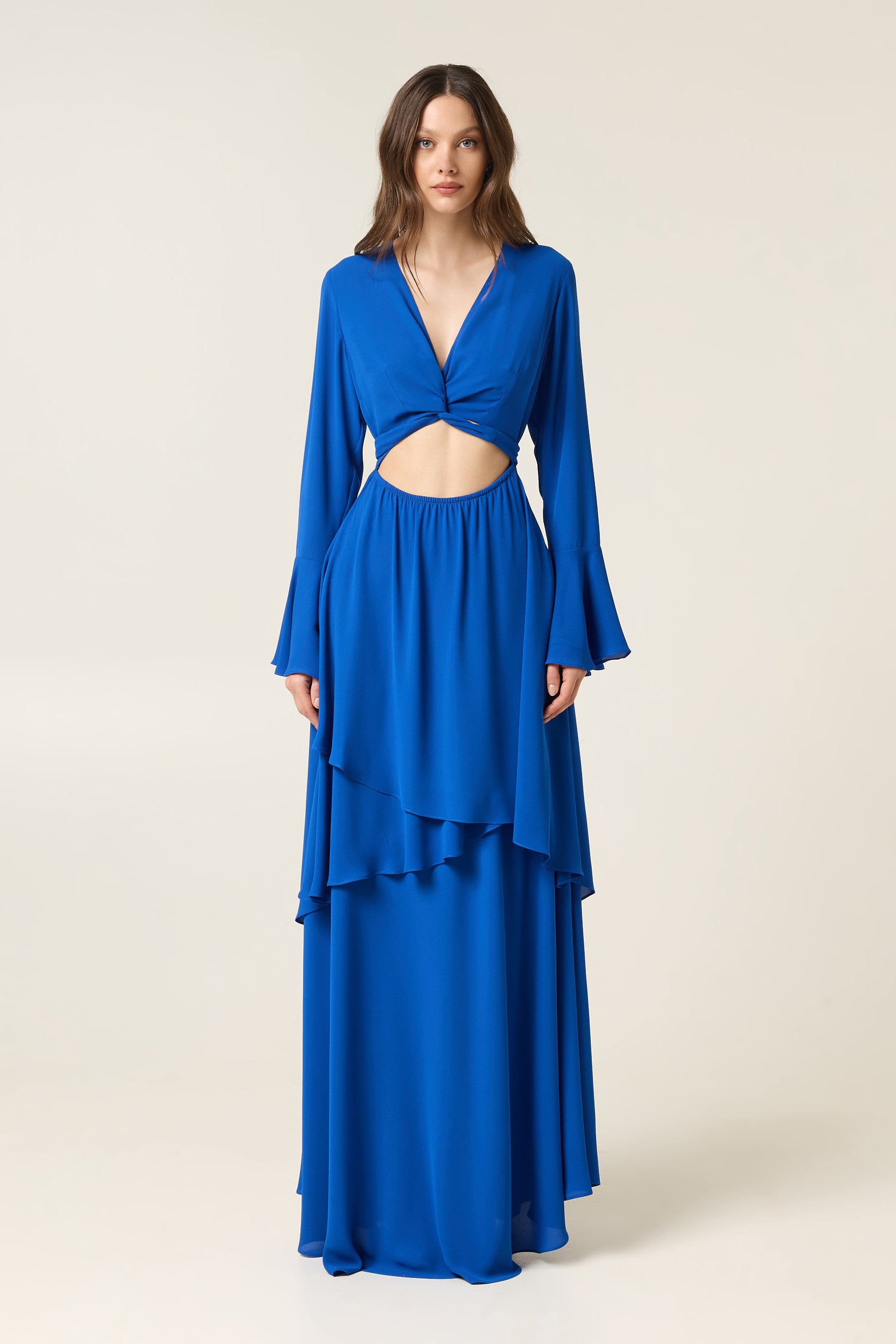 Το cut-out στο μπροστινό μέρος αναδεικνύει τη σιλουέτα με μοντέρνο τρόπο, ενώ τα μακριά μανίκια με άνοιγμα ισορροπούν το look, δημιουργώντας ένα elegant αλλά ταυτόχρονα statement αποτέλεσμα. Η maxi γραμμή επιμηκύνει το σώμα και κινείται αέρινα σε κάθε βήμα, ιδανική για εμφανίσεις που θέλουν να ξεχωρίζουν.