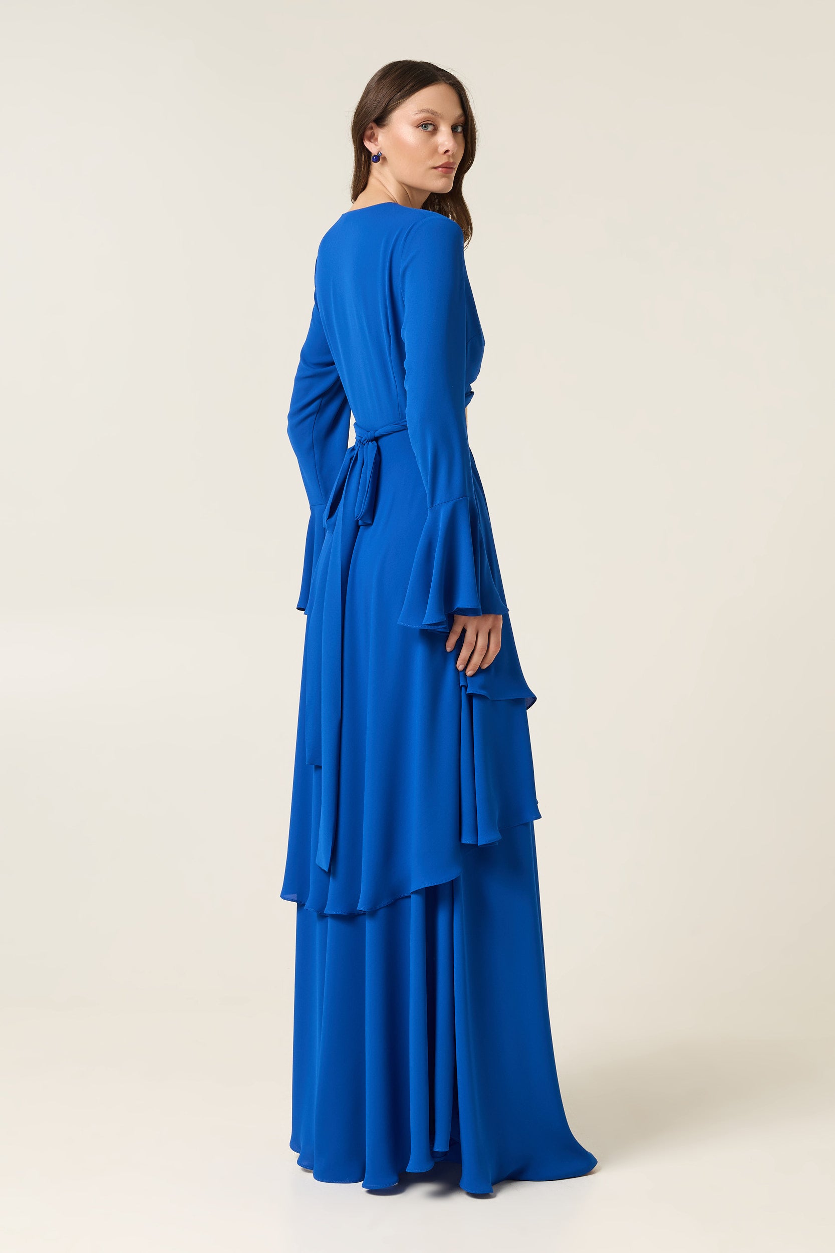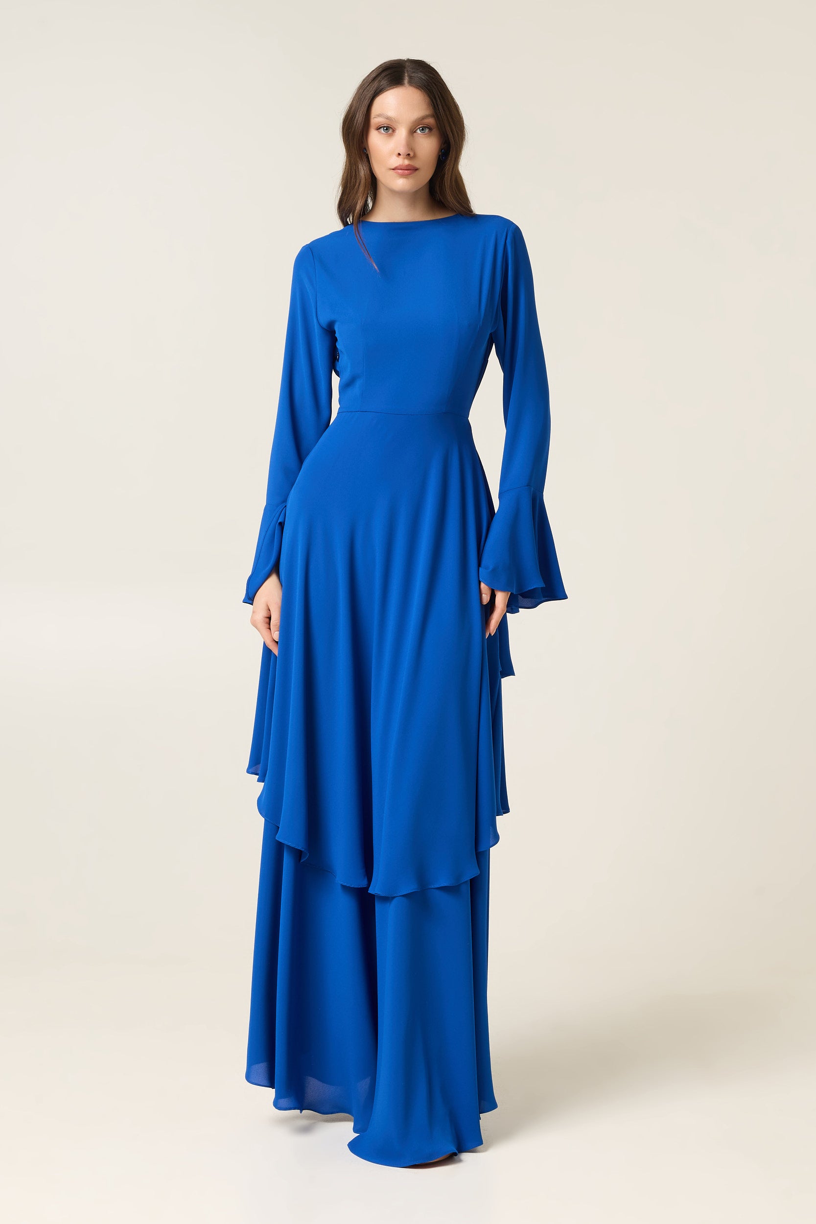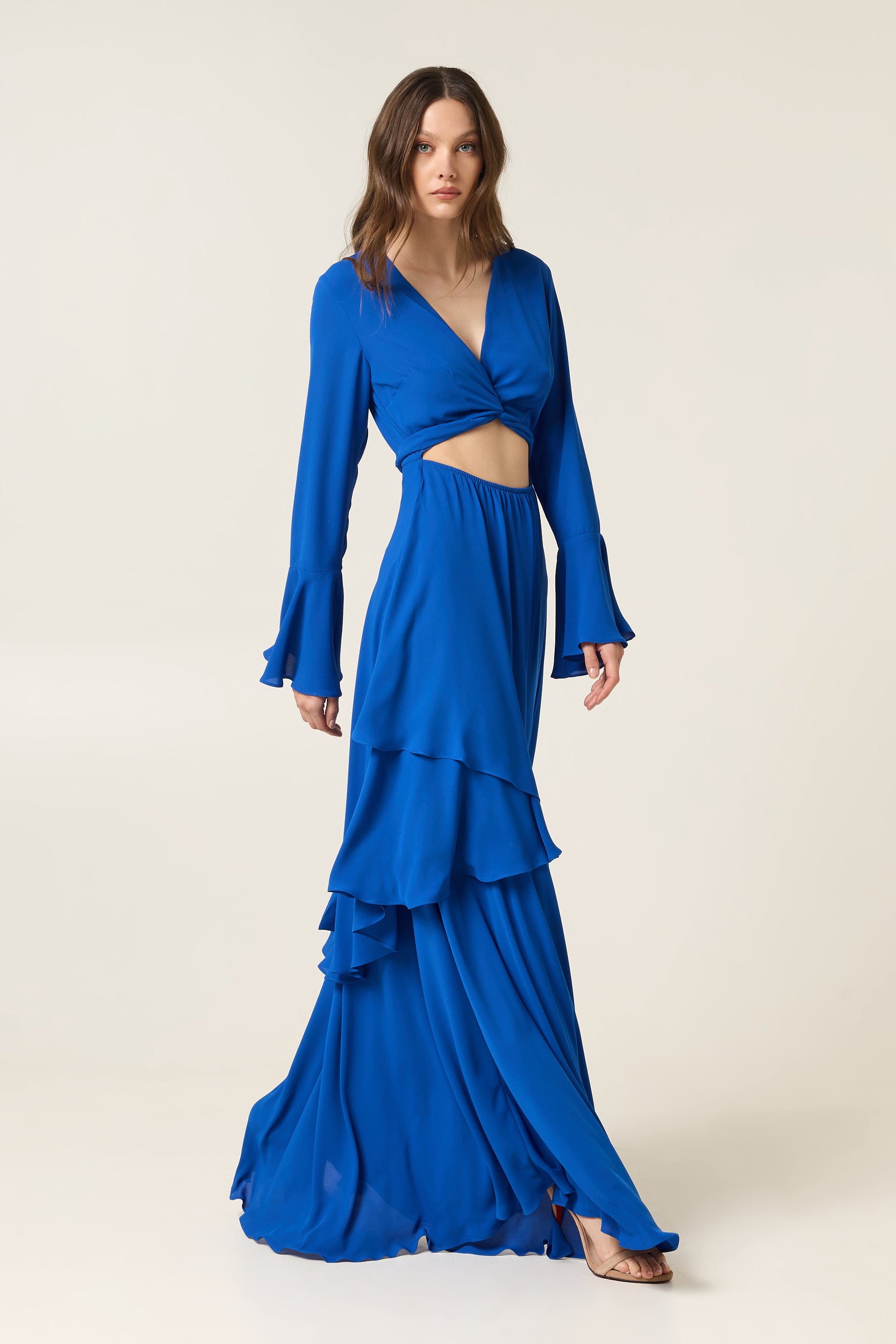 Το ELECTRIC BLUE MAXI DRESS WITH RUFFLES ξεχωρίζει για το εντυπωσιακό του χρώμα και τη ρευστή του κίνηση. Οι βολάν (ruffles) λεπτομέρειες δημιουργούν ένα layered αποτέλεσμα που προσθέτει όγκο, υφή και δυναμική στο σύνολο — χαρακτηριστικά που κάνουν τα ruffles διαχρονικά αγαπημένα στη μόδα, καθώς χαρίζουν κίνηση και έντονη θηλυκότητα .