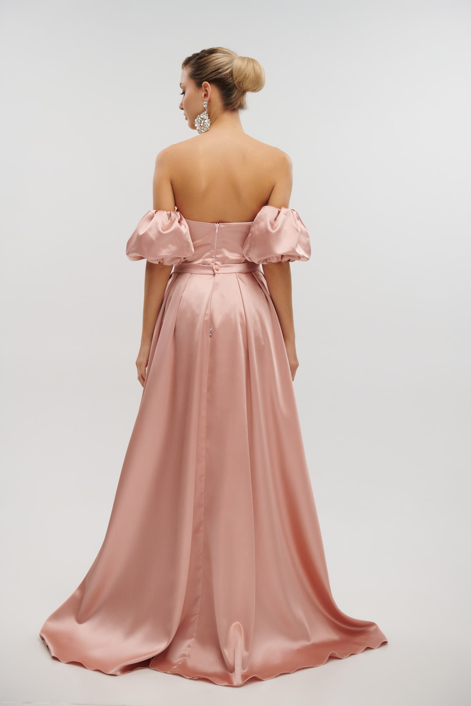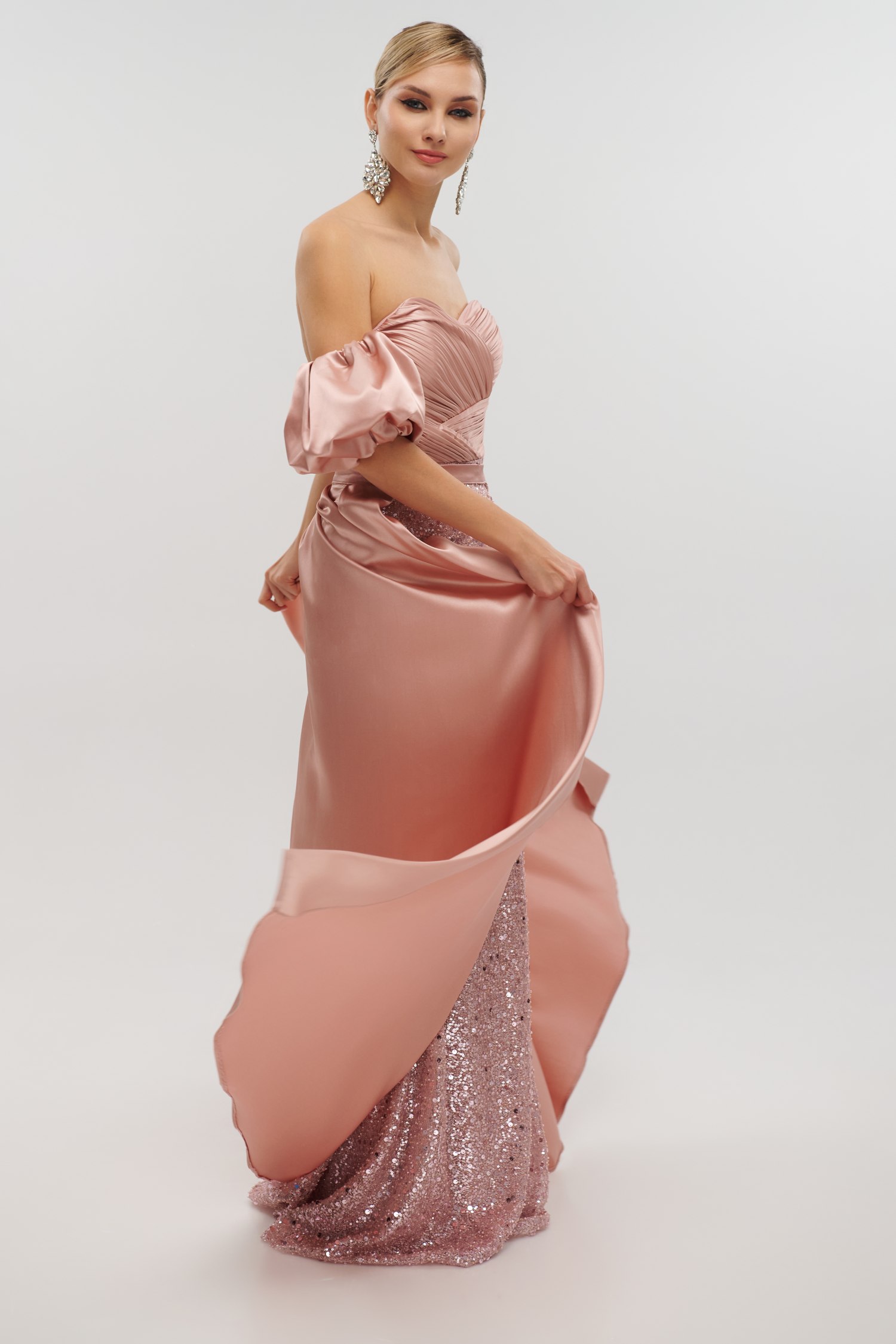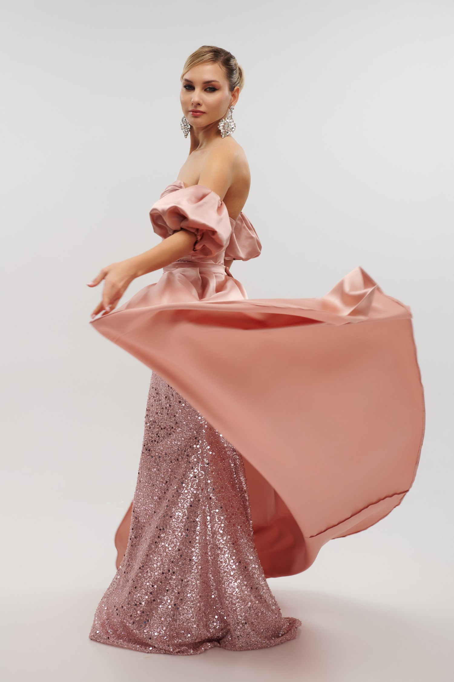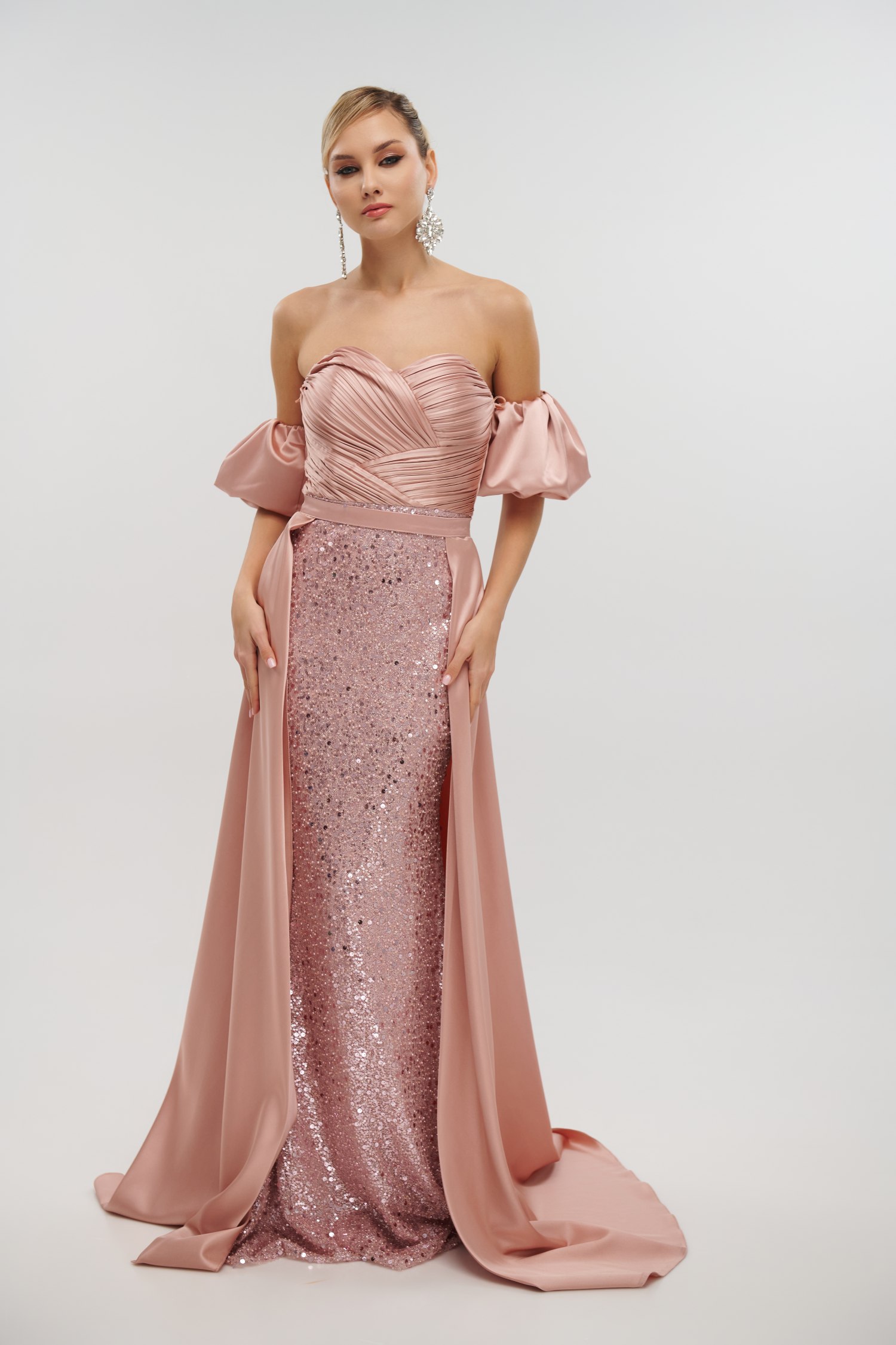 Maxi, glamorous, λαμπερό φόρεμα στη γλυκιά απόχρωση του old pink. Είναι strapless με μπανέλες και cups στο στήθος. Διαθέτει αποσπώμενα, φουσκωτά, σατέν μανίκια. Η φούστα του είναι όλη κεντημένη με παγιέτες και πέρλες. Η έξτρα αποσπώμενη, σατέν, φούστα του κουμπώνει με κουμπί. Κλείνει στην πλάτη με φερμουάρ.