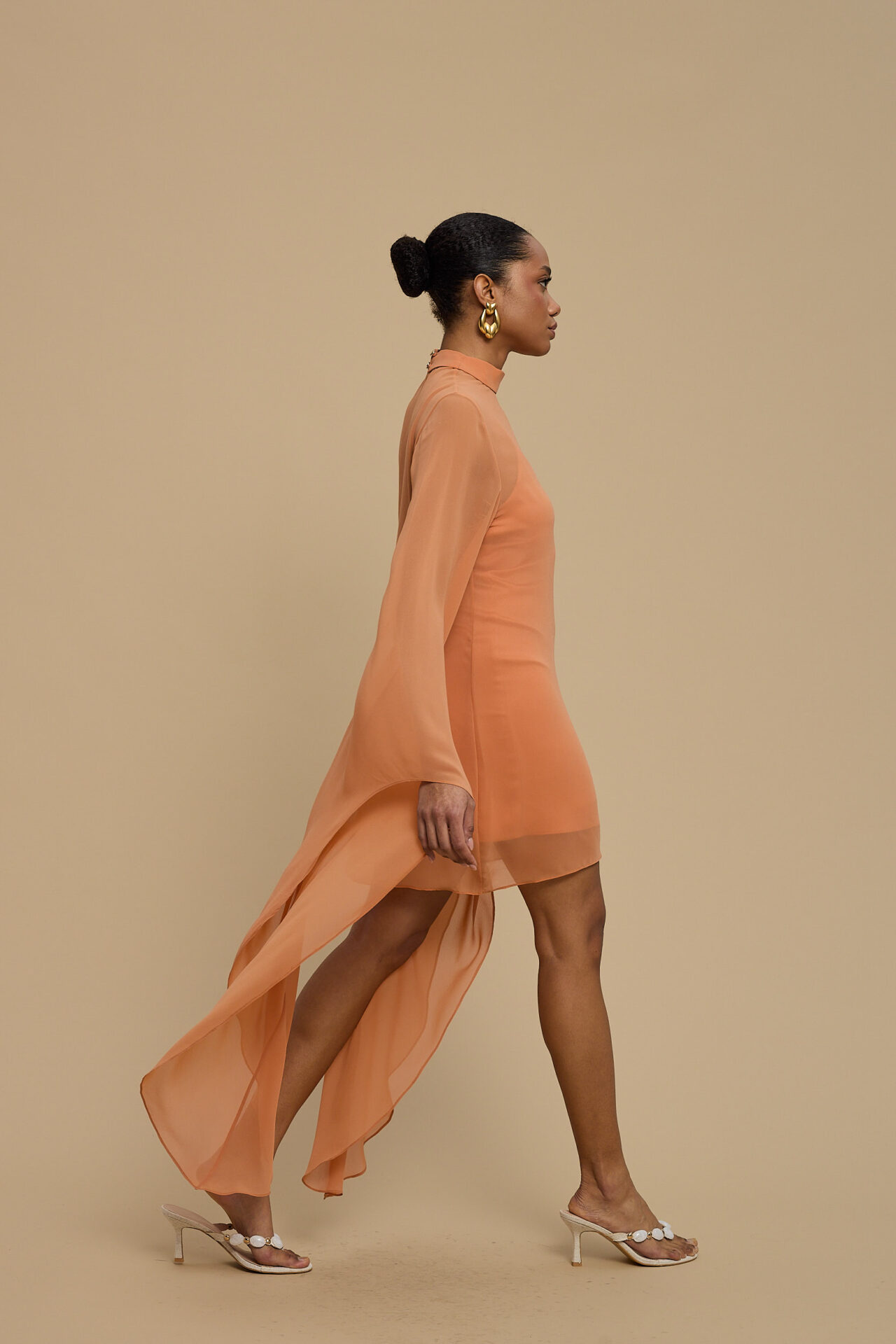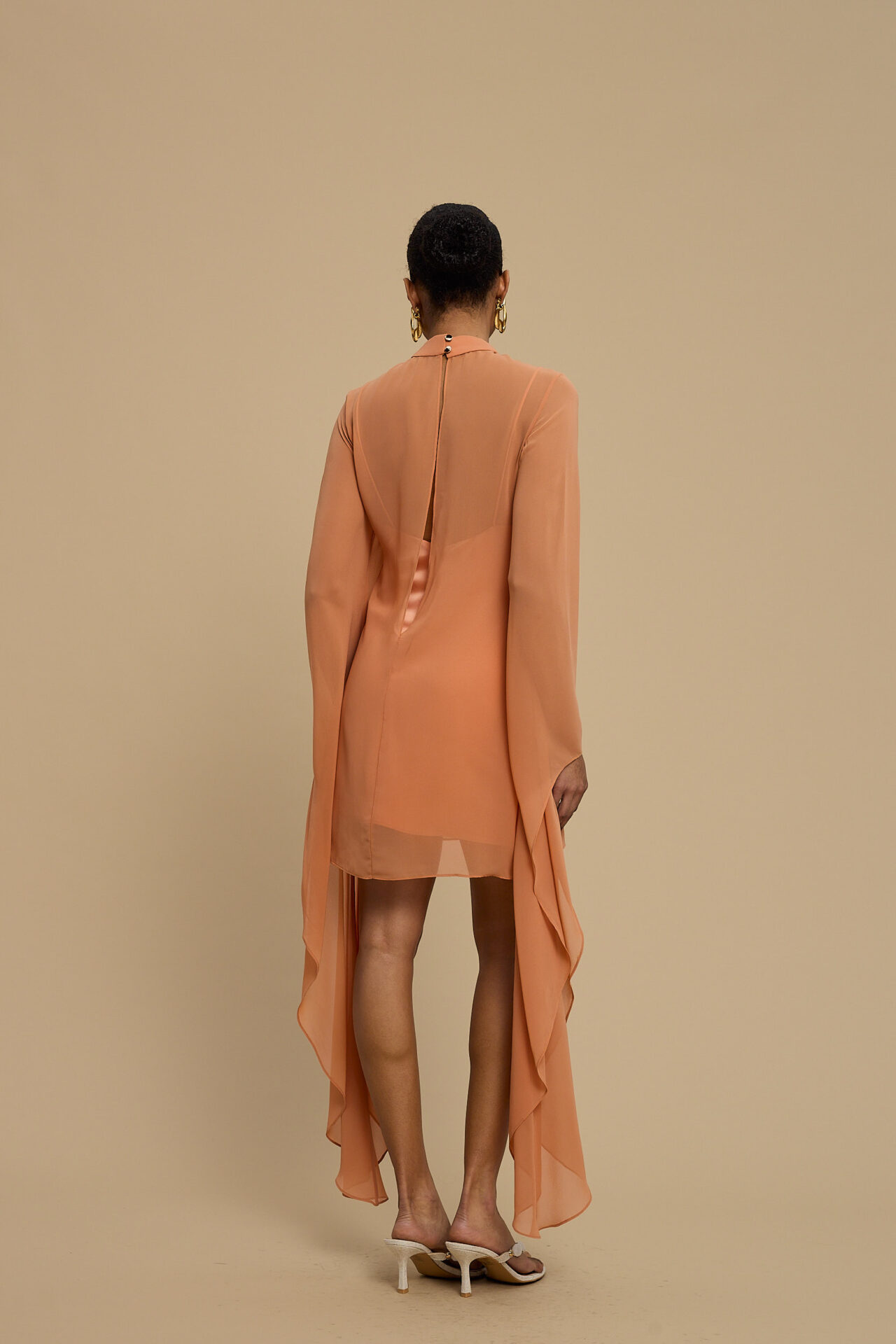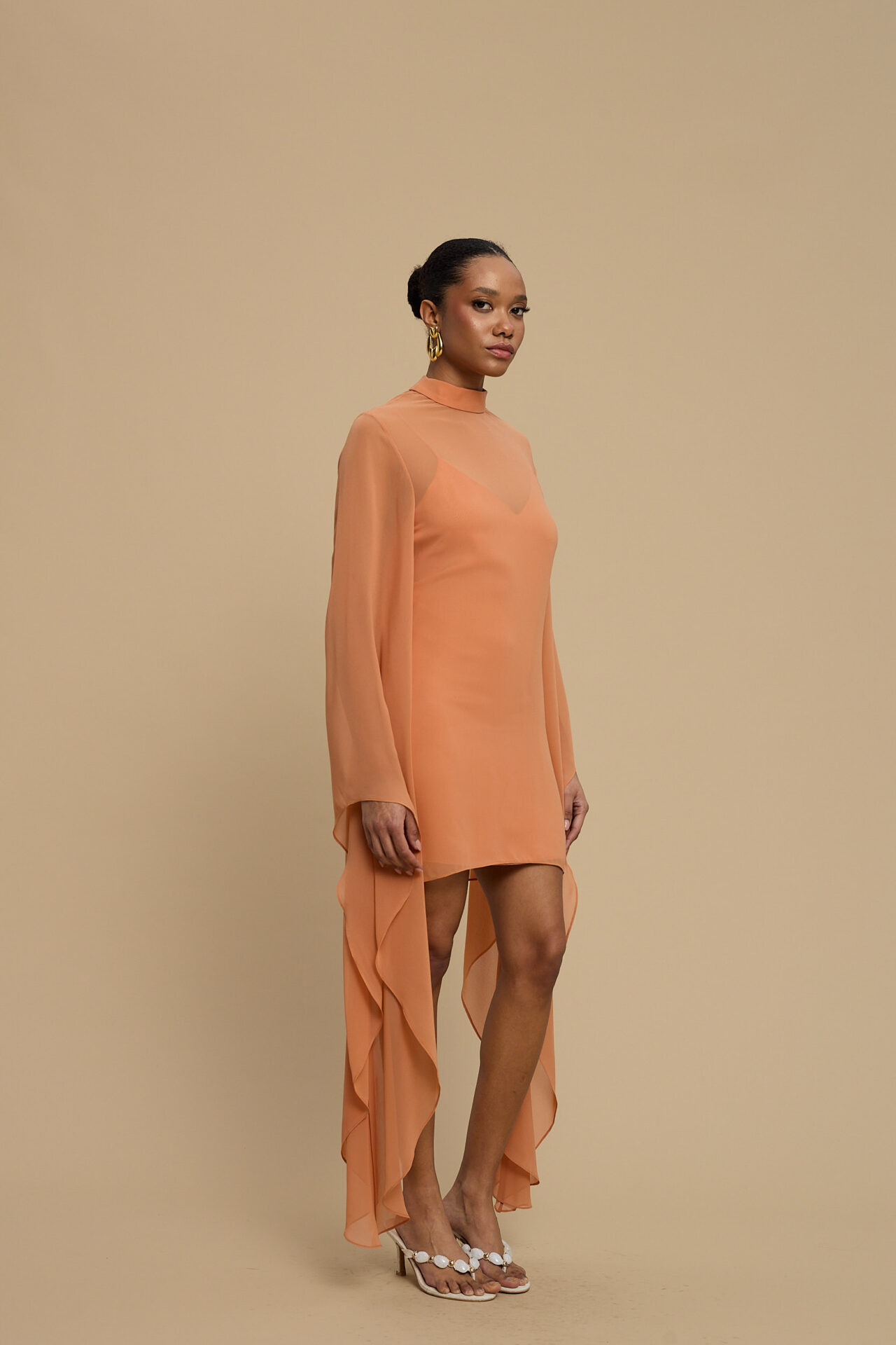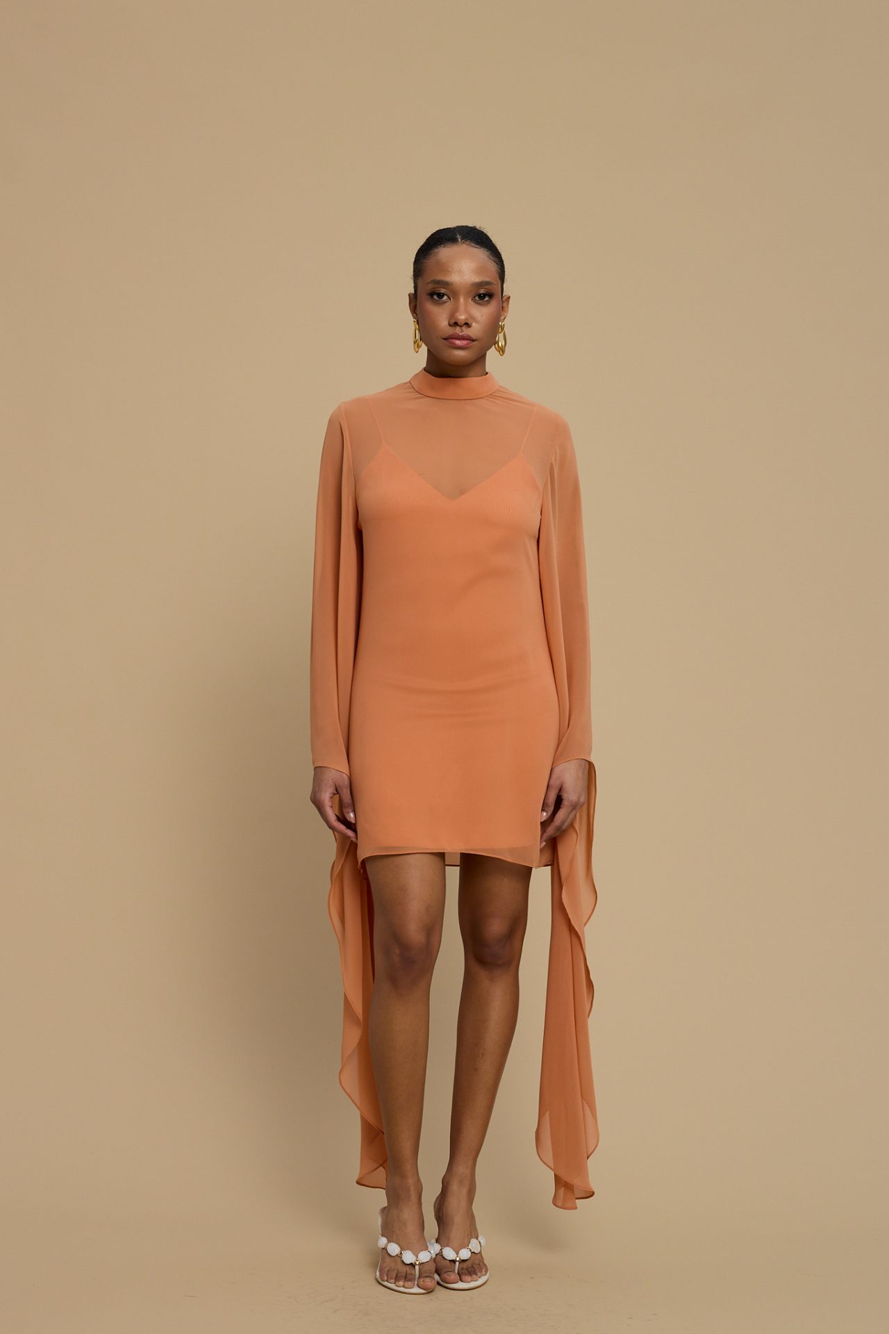 An ethereal mini dress with a layered cape covering the neck and sleeves.