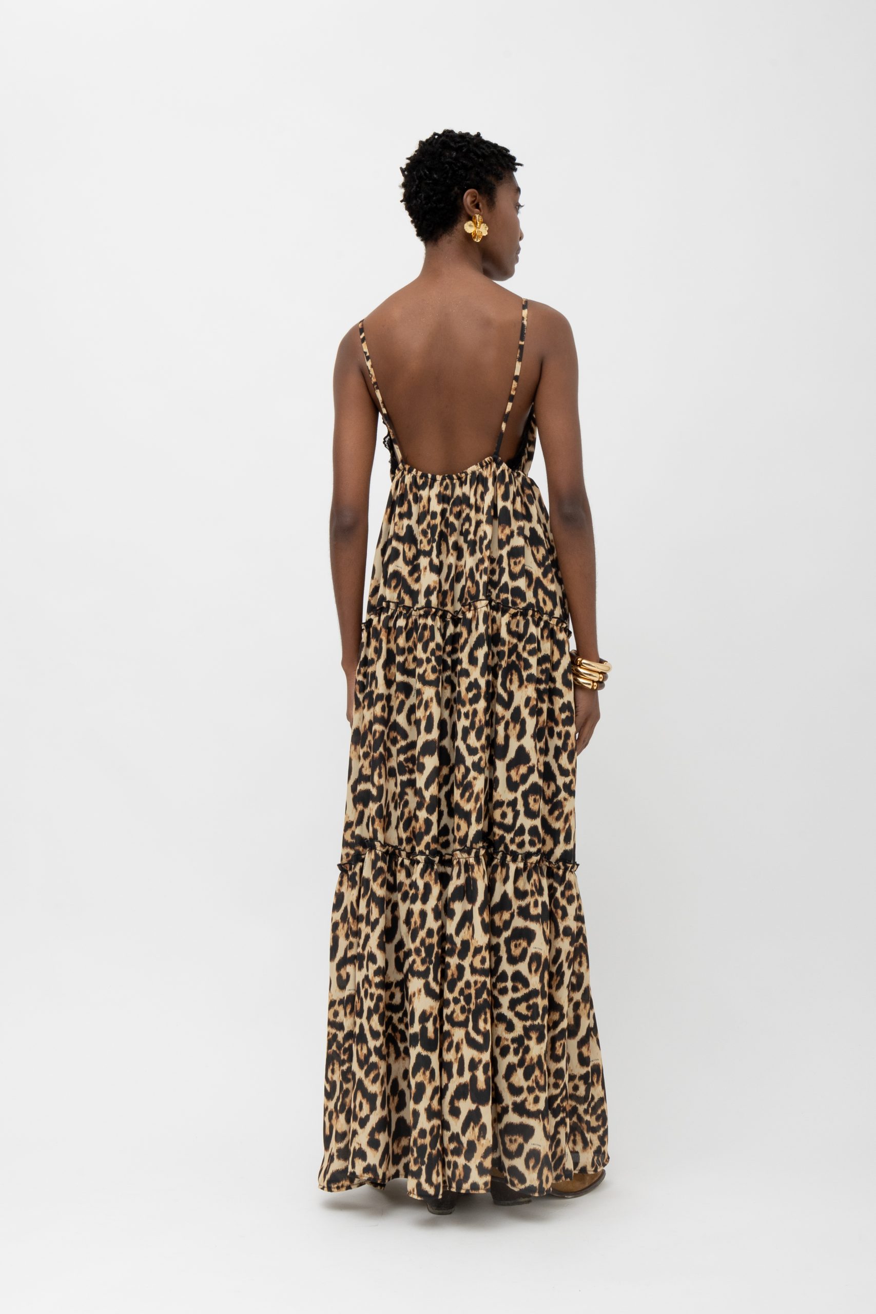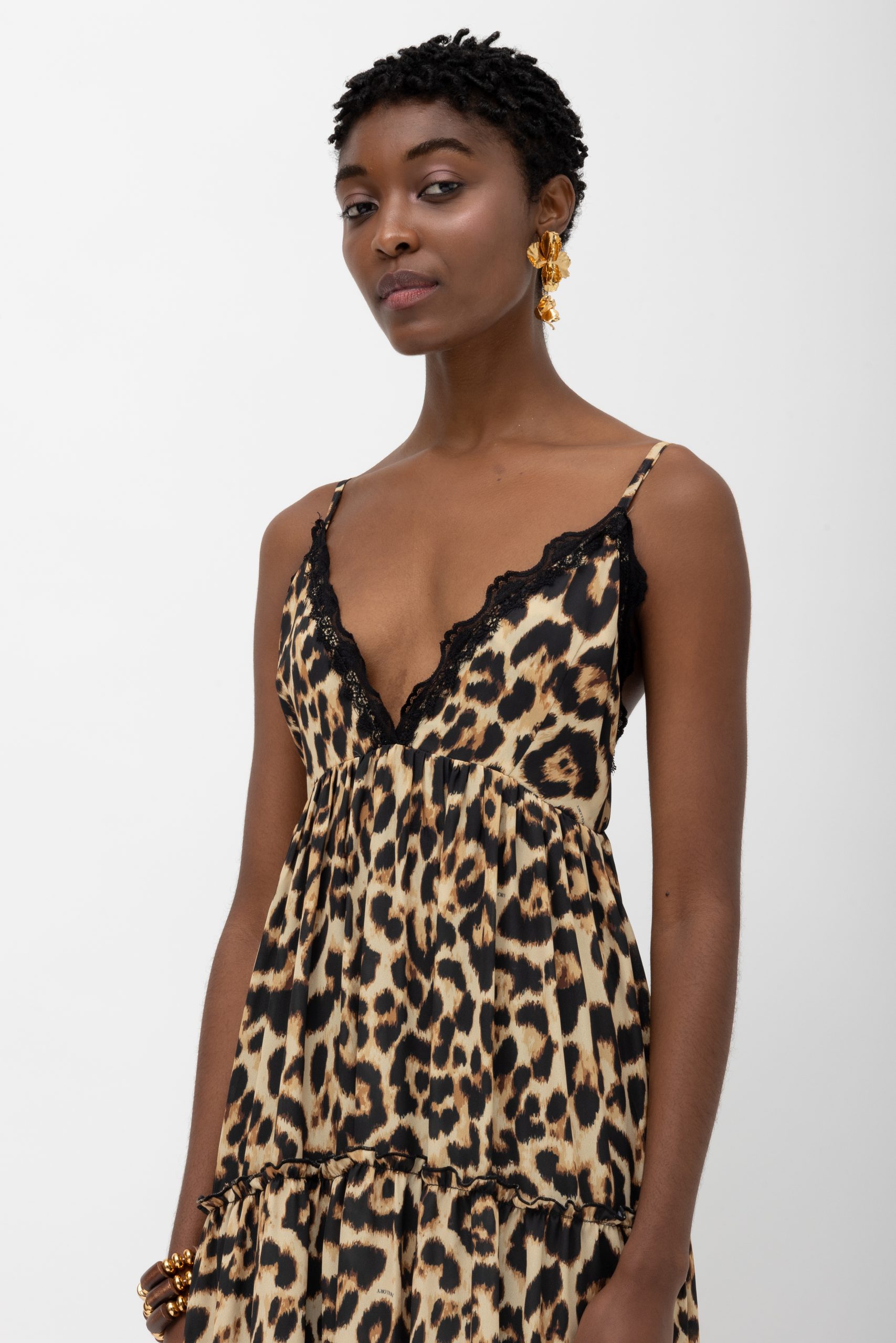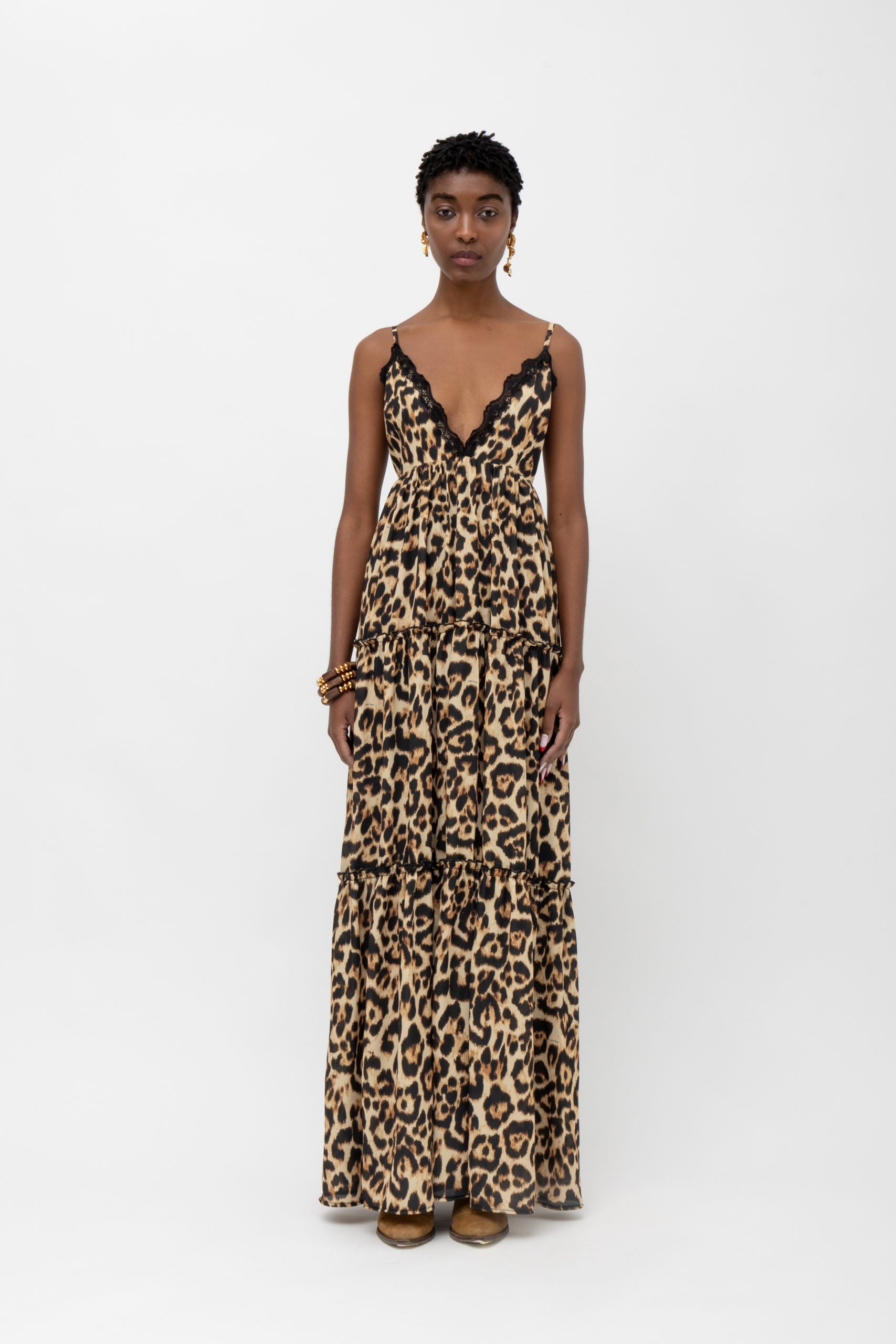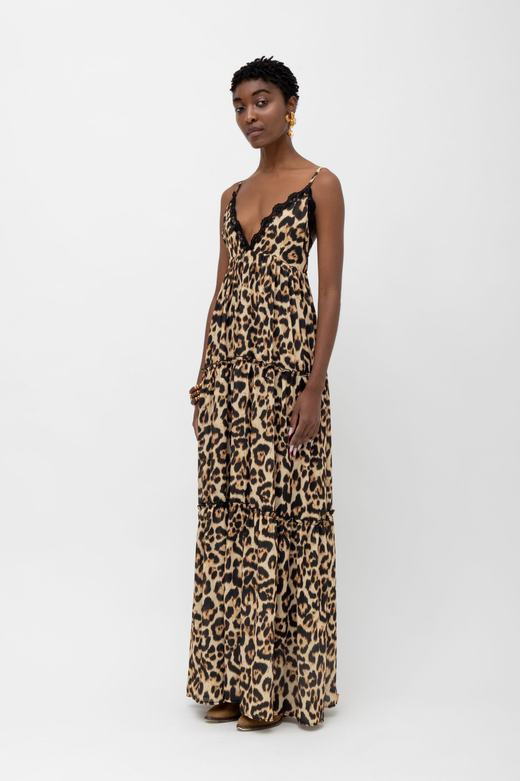 Wildly romantic. This flowing leopard-print maxi dress features soft tiers for movement and volume, while delicate black lace along the plunging neckline adds a touch of feminine contrast. The silhouette is light, easy, and effortlessly eye-catching.
