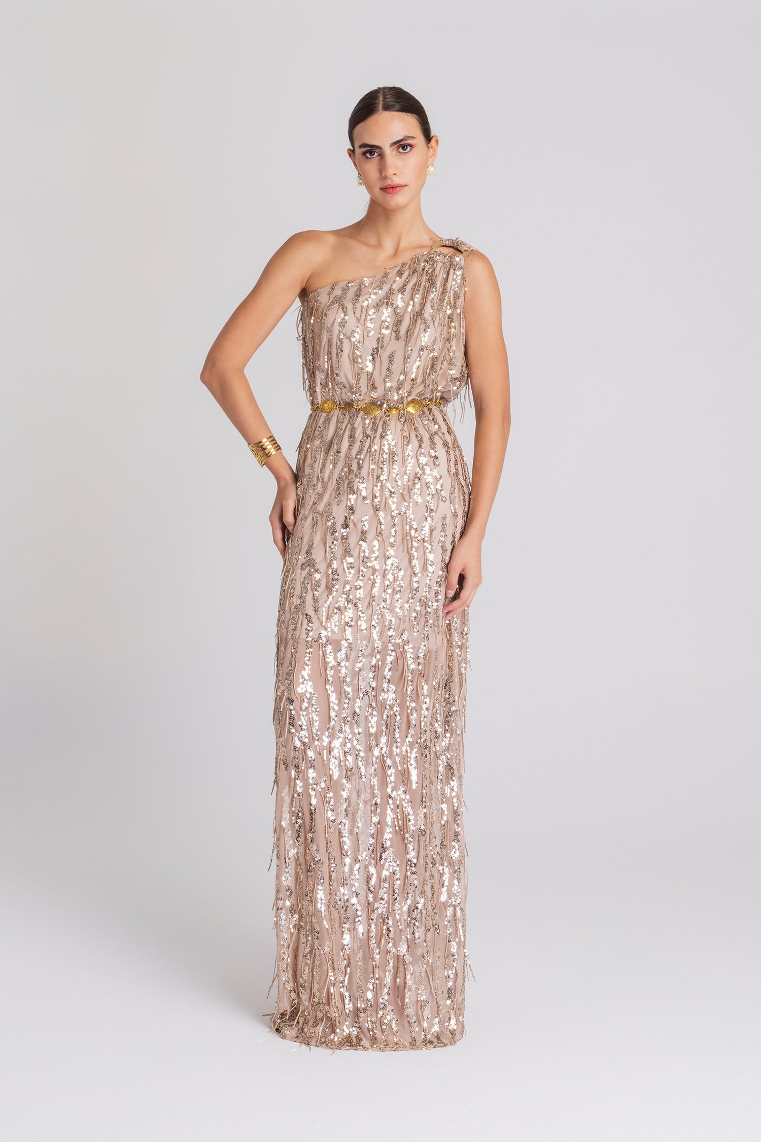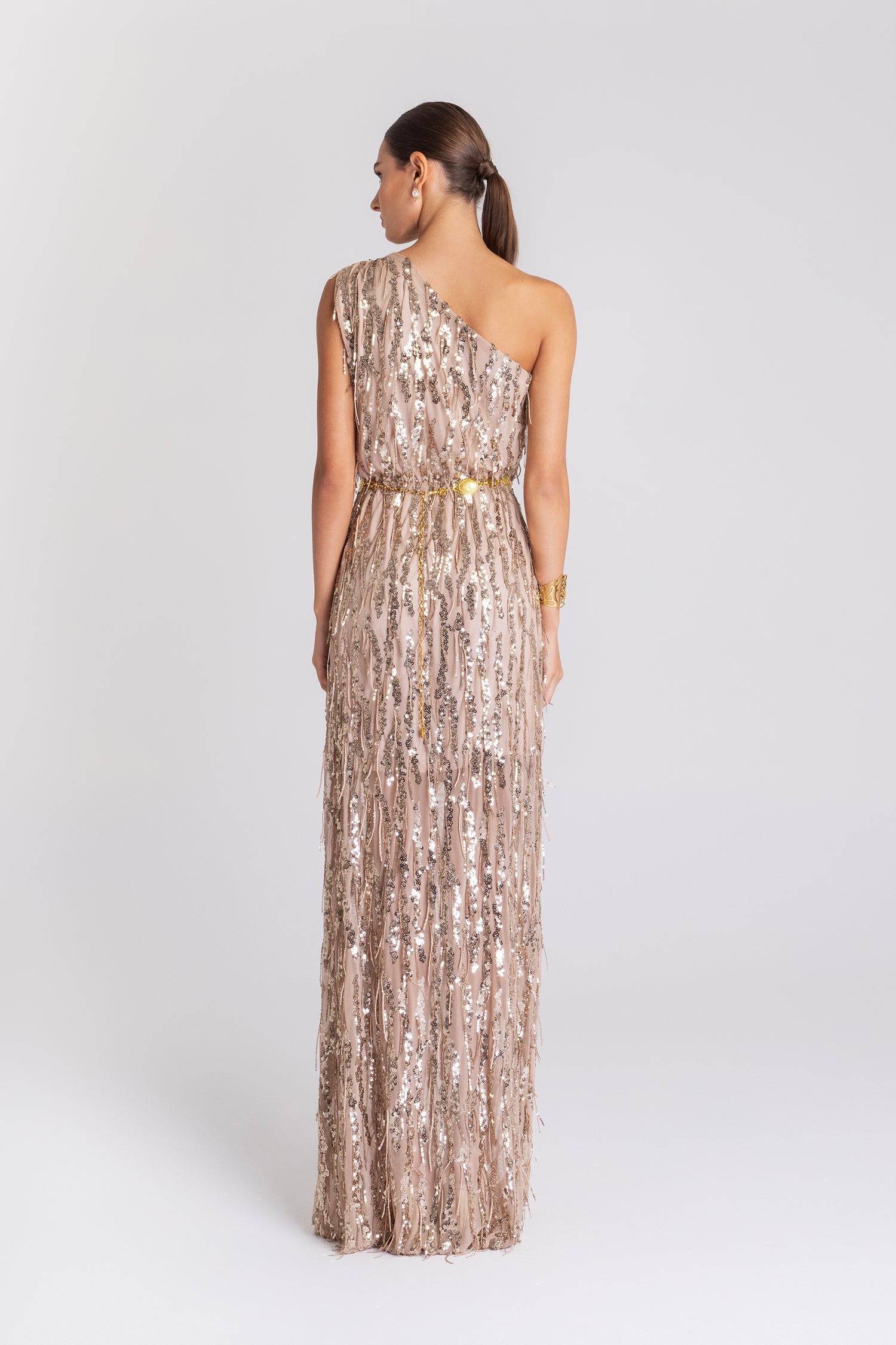 Φόρεμα με ένα ώμο και εντυπωσιακές παγιέτες σε χρυσούς τόνους
