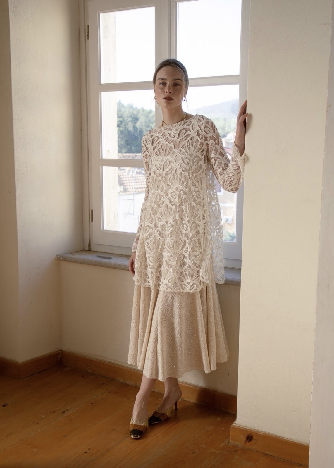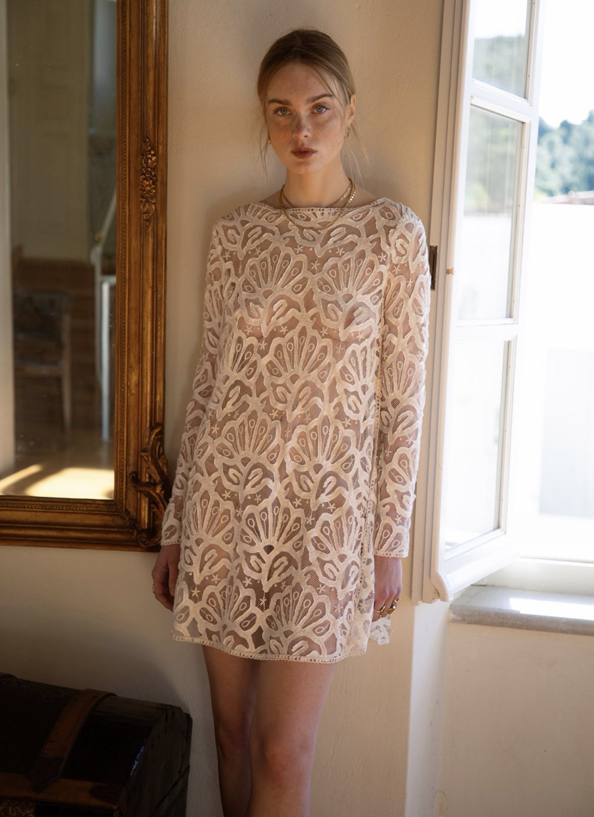 Nidodileda – Openness Mini Topdress Embroidered Lace Slitted – Off White