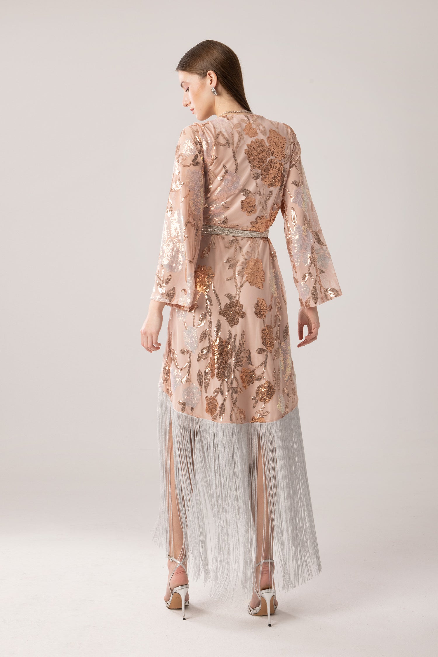 Εντυπωσιακό κιμονό/φόρεμα σε nude ροζ απόχρωση με χρυσά floral παγιέτα μοτίβα που χαρίζουν πολυτελή λάμψη. Το κρουαζέ σχέδιο αγκαλιάζει κομψά τη σιλουέτα, ενώ η διακοσμητική ζώνη με παγιέτα τονίζει τη μέση και προσθέτει glam χαρακτήρα.